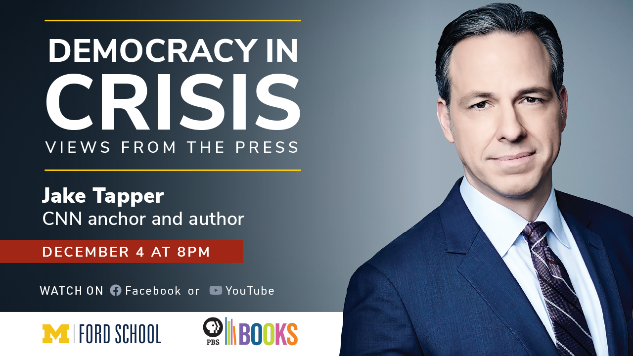 Join for a special event featuring CNN anchor and Chief Washington correspondent, Jake Tapper, as part of the continuing series: “Democracy in Crisis: Views from the Press."