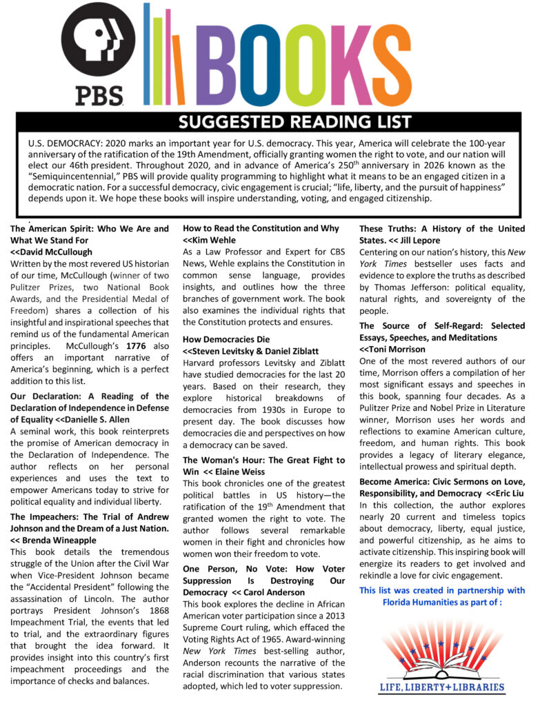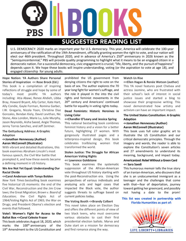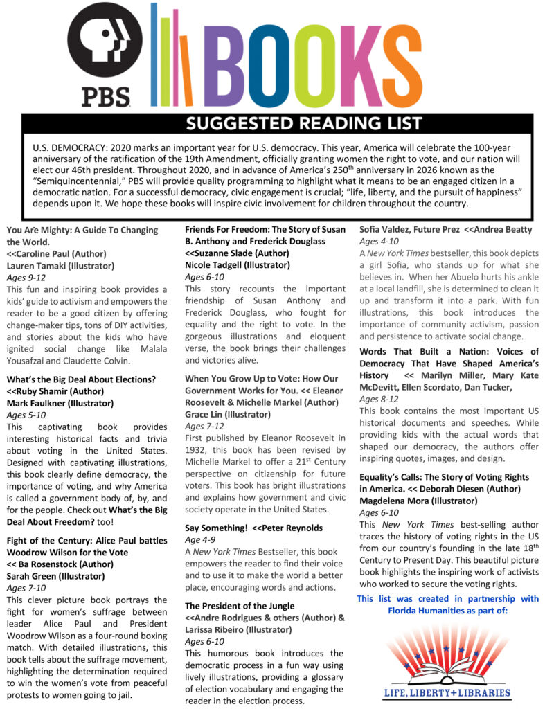 U.S. DEMOCRACY: 2020 marks an important year for U.S. democracy. This year, America will celebrate the 100-year anniversary of the ratification of the 19th Amendment, officially granting women the right to vote, and our nation will elect our 46th president. Throughout 2020, and in advance of America’s 250th anniversary in 2026 known as the “Semiquincentennial,” PBS will provide quality programming to highlight what it means to be an engaged citizen in a democratic nation. For a successful democracy, civic engagement is crucial; “life, liberty, and the pursuit of happiness” depends upon it. We hope these books will inspire understanding, voting, and engaged citizenship.