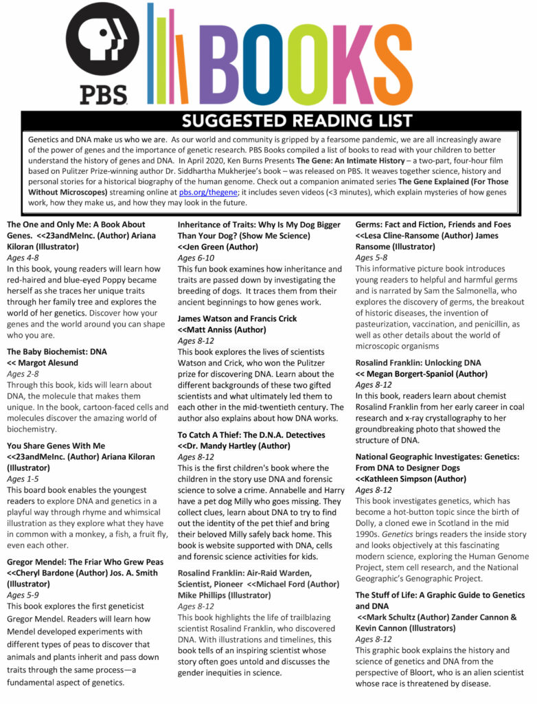 Genetics and DNA make us who we are. As our world and community is gripped by a fearsome pandemic, we are all increasingly aware of the power of genes and the importance of genetic research. PBS Books compiled a list of books to read with your children to better understand the history of genes and DNA. In April 2020, Ken Burns Presents The Gene: An Intimate History – a two-part, four-hour film based on Pulitzer Prize-winning author Dr. Siddhartha Mukherjee’s book – was released on PBS. It weaves together science, history and personal stories for a historical biography of the human genome. Check out a companion animated series The Gene Explained (For Those Without Microscopes) streaming online at pbs.org/thegene; it includes seven videos (<3 minutes), which explain mysteries of how genes work, how they make us, and how they may look in the future. Download as a PDF >
